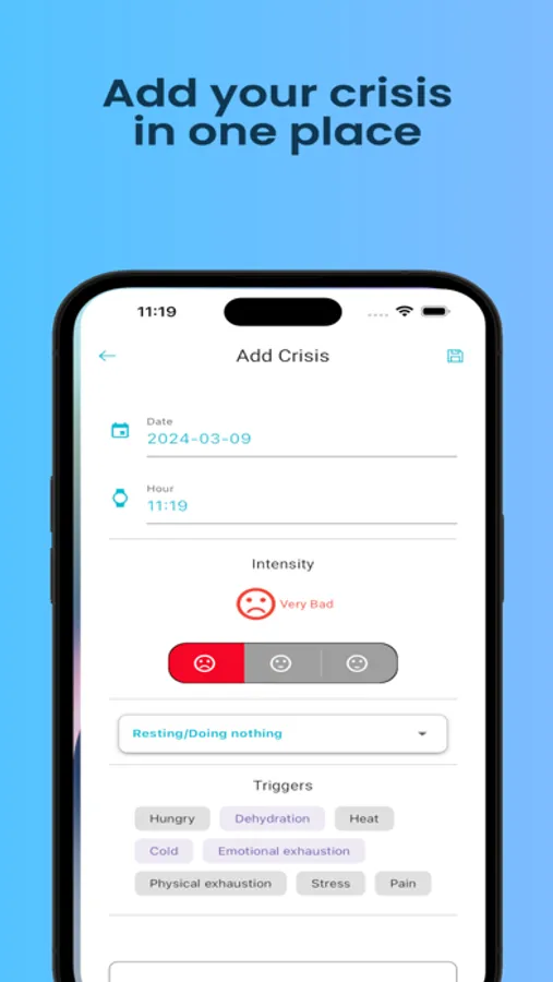 This application is an aid for those who suffer dysautonomia. Here you can add your crisei and moods.