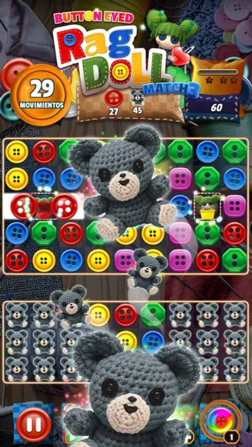 Welcome to Button Eyed Rag Doll Match 3, a fun and addictive puzzle game where you have to match colorful buttons to help a cute ragdoll find her way home.