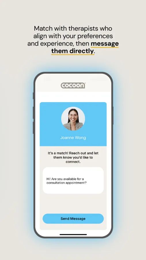 Cocoon is a client-therapist matching app designed to help you find the right therapist based on your unique needs, background, and preferences. Whether you’re seeking support for anxiety, stress, trauma, relationships, life transitions, grief or more, Cocoon will connect you with a licensed therapist who truly gets you in just a swipe!