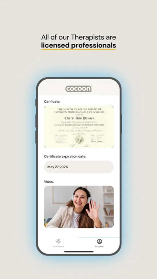 Verified, Vetted Professionals – Trust our pool of licensed therapists, vetted by Cocoon so you can be sure you’re taken care of by experts.