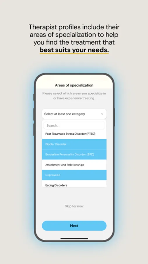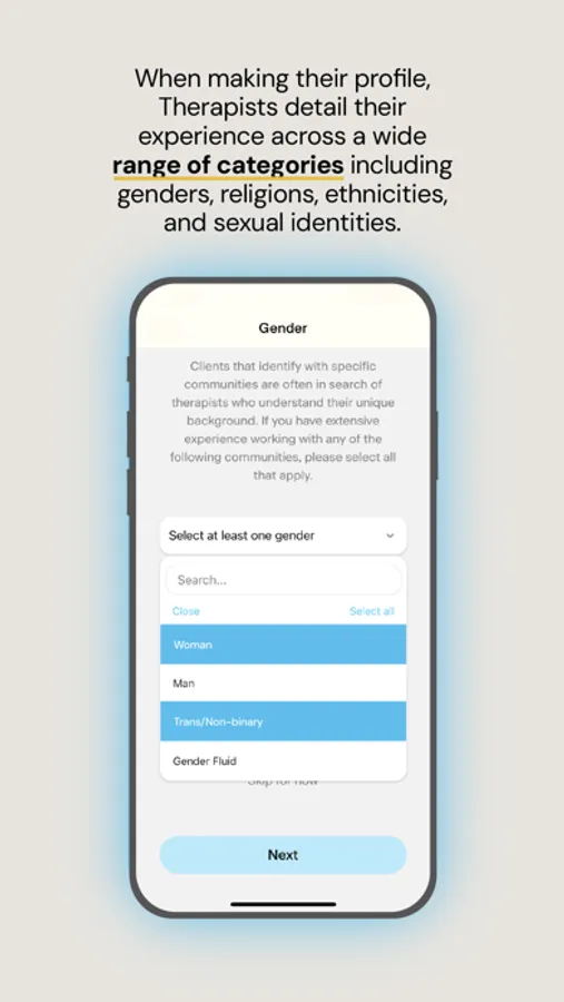 Custom Filters – Finetune your search with our easy-to-use filters to find therapists who fully align with your needs, background, and preferences.