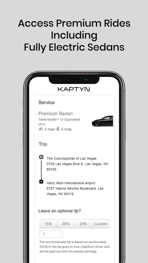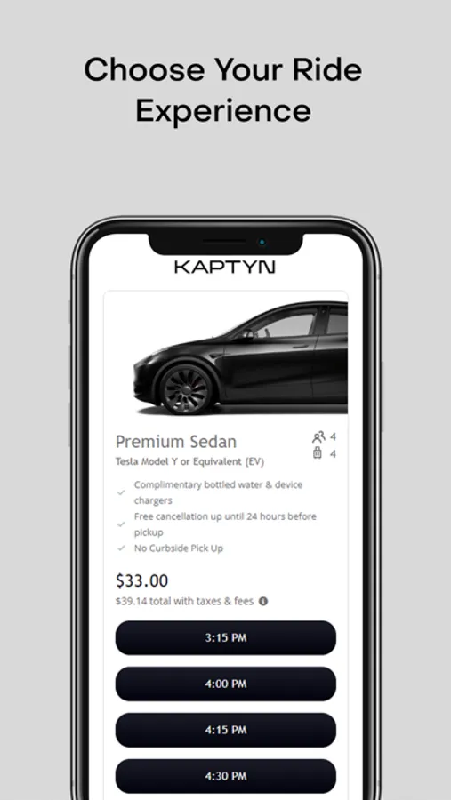 With Kaptyn, you have options. Choose between premium electric luxury rides, all available right from your member app. Whether you're looking for a quick airport transfer with the most direct route, or a way to treat yourself for a big night out – we have the ride to suit your needs and mood.