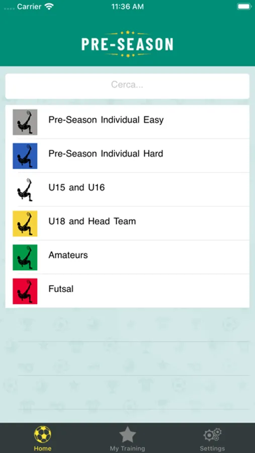 Children and juniors, Amateur and semi-pro, 5-player soccer (futsal), First Team and professional, plus an individual Preparation training.