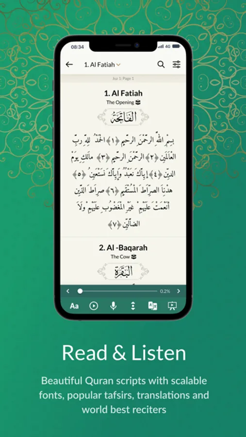 Read the beautiful Quran scripts with scalable fonts, popular tafsirs, translations and world best reciters.