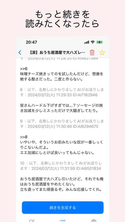 >>6 確かに、無料で試せるのはありがたいよな。 けど、ハマったらすぐ課金しちゃいそうw 1日3回も新しいスレ立てられたら、もう現実に戻れない気がするわ。 仕事中とか、ついつい開いちゃいそう。 でもまぁ、他に暇つぶしアプリに課金するくらいなら、「ねらーAI」で遊ぶ方がよっぽど面白そうだしな!