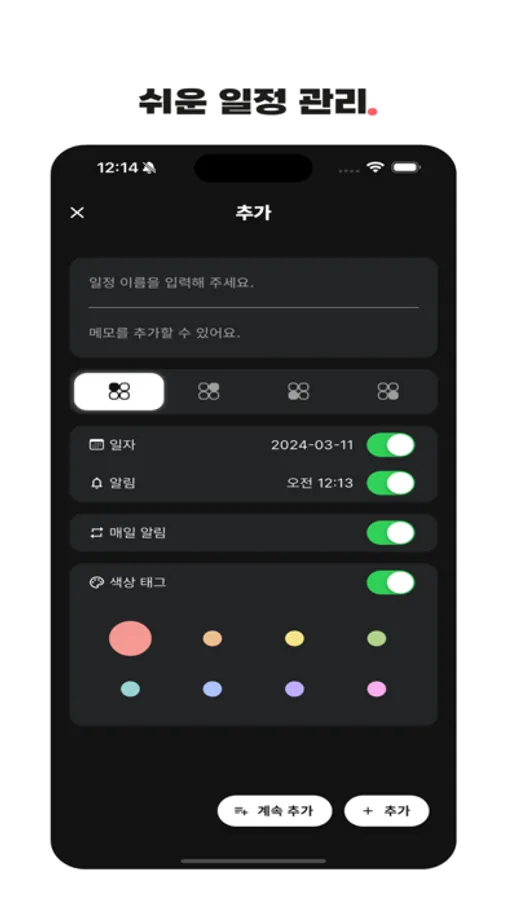 - 회사, 집, 약속, 경조사, etc... 색상 태그로 다양한 일정을 쉽게 분류해 보세요.