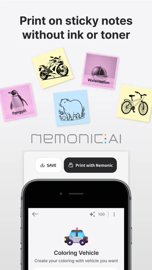 The Nemonic Printer is a compact printer that prints sticky notes without the need for ink or toner. It can be connected to the Nemonic app via Bluetooth and prints quickly within 5 to 10 seconds. It can also be connected to a PC and has various features, including a dispenser function and paper color indication.