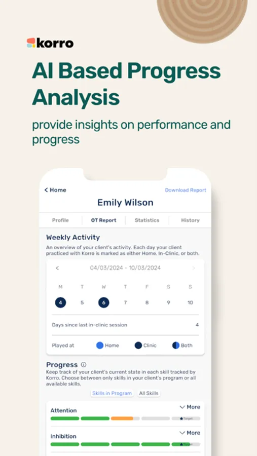 Customized Client Programs: Korro assists the OTPs to understand the user’s state and progress, and to make more educated decisions about adjusting exercise programs and therapy in real-time to maintain optimal engagement