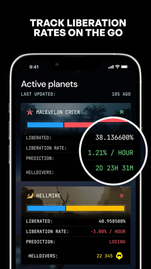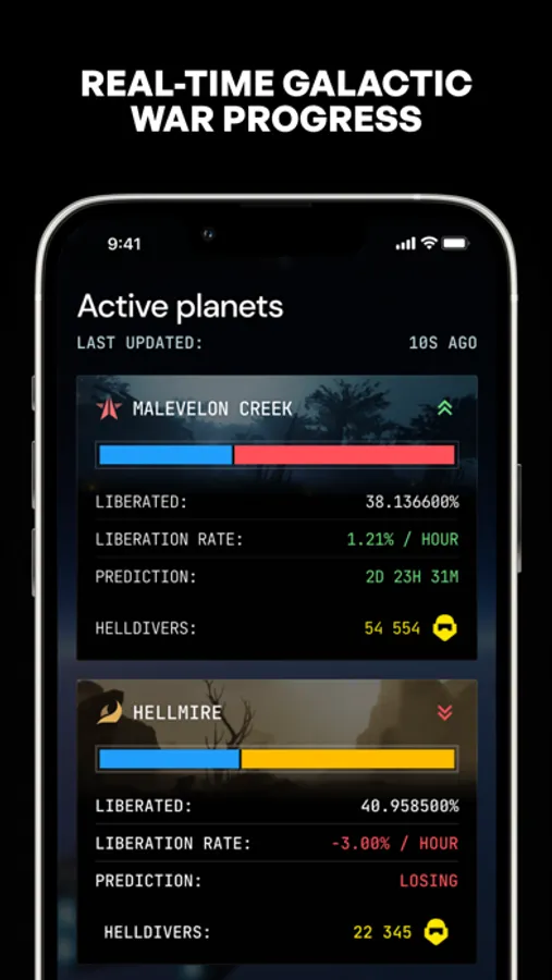 Monitor planet status, liberation progress, effects, and frontlines with up-to-date reports.
