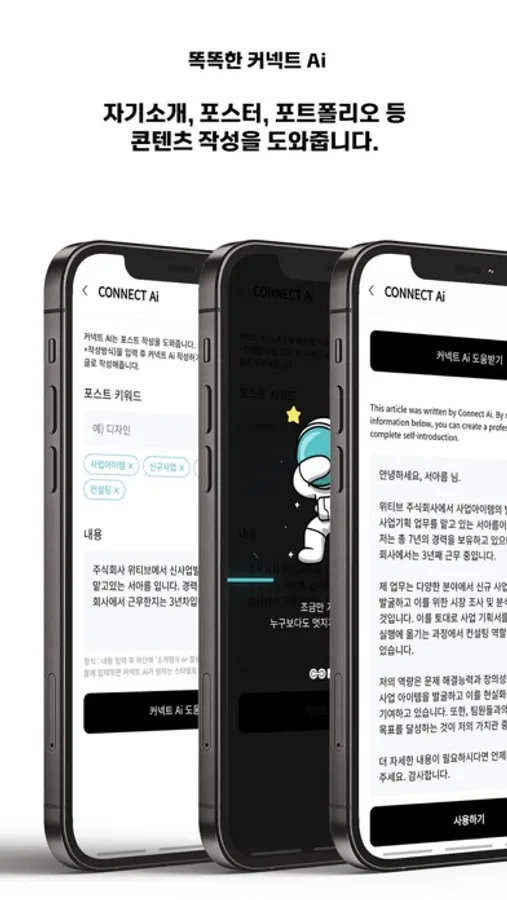6. 코웍기능 : 커넥트의 코웍 기능은 창업 아이디어의 실현을 위해 특별히 설계되었습니다. 이를 통해 창업자는 동료를 찾고, 팀을 구성하며, 프로젝트를 발전시킬 수 있습니다.