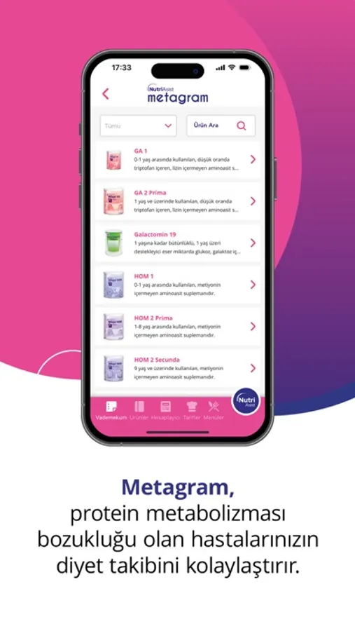 Metagram: Protein metabolizması bozukluğu olan hastalar için özel diyet planları sunar ve diyet takibini kolaylaştırır. Metagram sayesinde hastaların beslenme programlarını daha etkin bir şekilde yönetebilirsiniz.