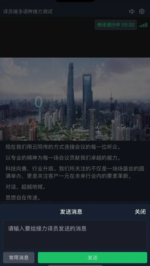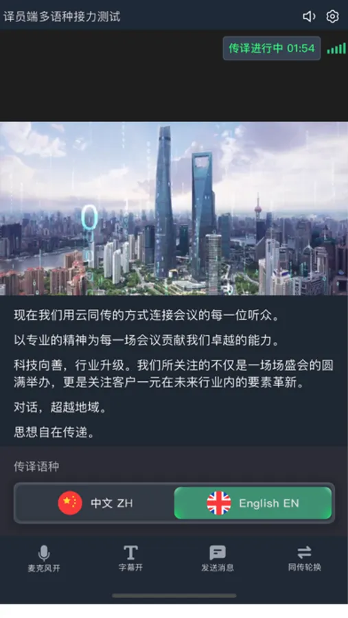 译牛云同传是一款致力于国内外国际会议的智能云同传翻译系统,系统以AI为内核,结合云端传输技术为国际范围内的线上线下会议提供一站式同传解决方案。软件提供了译员接入会议进行同声传译的功能,向译员提供现场画面、声音以及多种辅助翻译功能。
