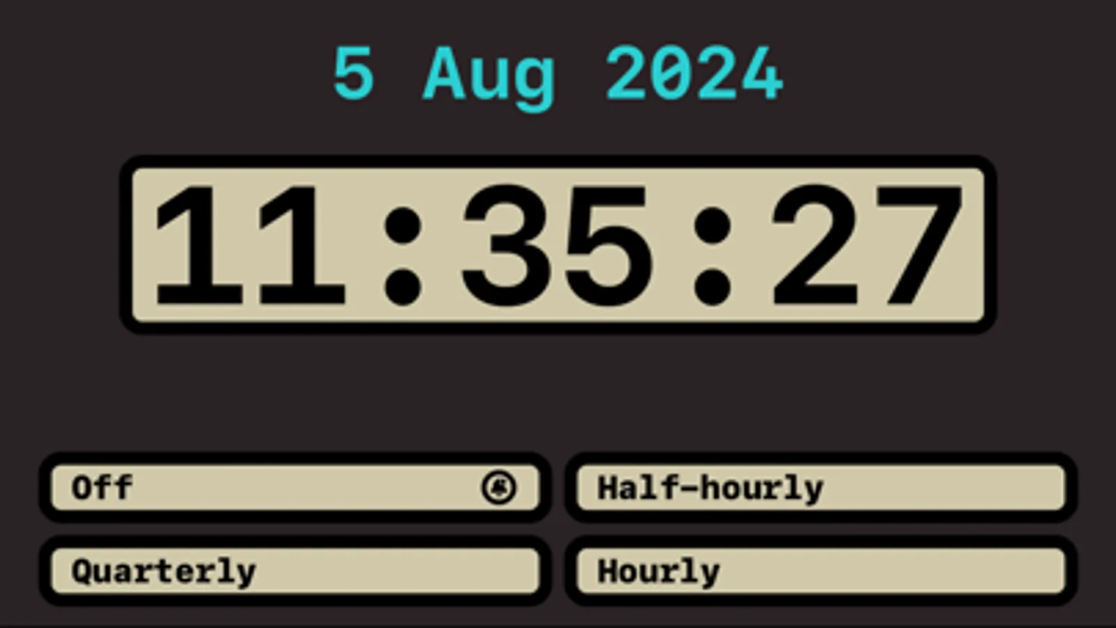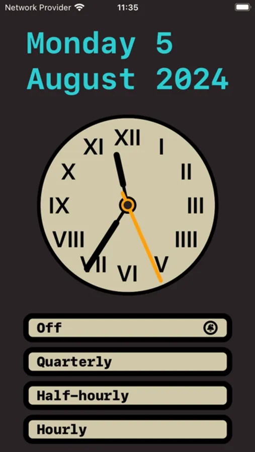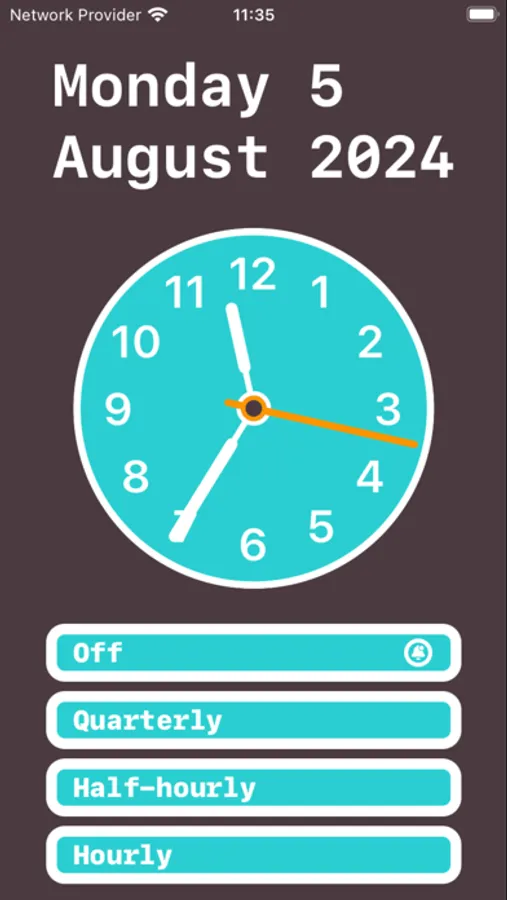 An app for people who struggle with keeping track of time or with time-blindness. This beautiful and yet simple app will notify you every quarter of an hour, half-hour, or hour depending on the option you choose. By doing so it will help you keep track of time.