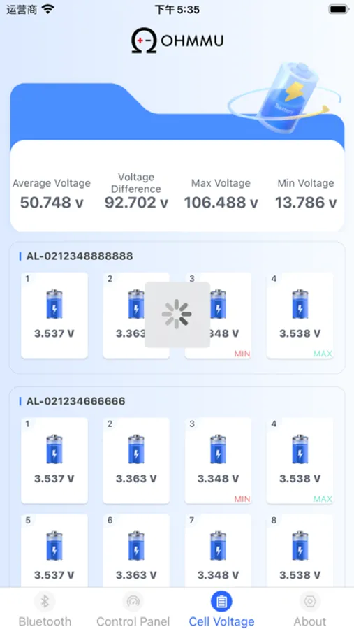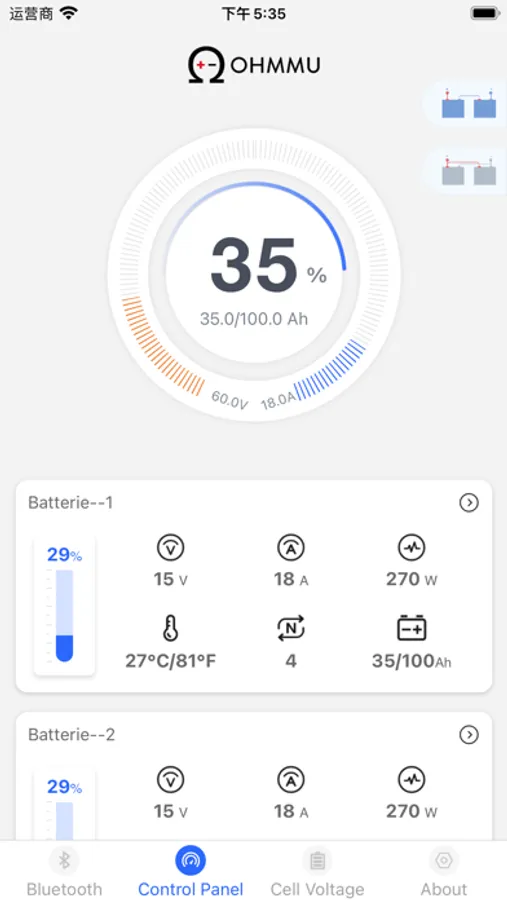 Ohmmu Energy's interface app for our 12V LFP batteries with Bluetooth-enabled BMS (and future applications) provides high-level functionality and features, such as: State Of Charge, monitoring of battery health, total and per cell voltage, amp input/output, temperature status, and more.