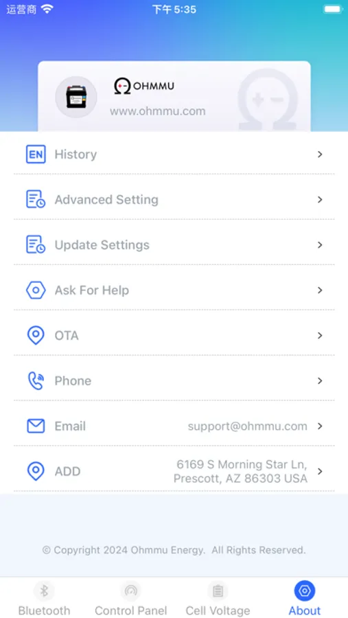 This app is also used to perform battery resets and will be used to reprogram BMS settings in the future. Future updates will include compatibility with Ohmmu Smart devices for a seamless mobile smart-RV/boat experience.