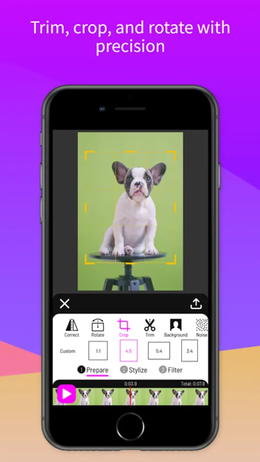 PROFESSIONAL EDITING SUITE Refine your footage before transforming it. • Green Screen (Chroma Key): Remove backgrounds and replace them with paintings or custom images. • Crop & Trim: Adjust the aspect ratio and cut unwanted parts. • Geometric Transforms: Rotate, flip, and adjust orientation.