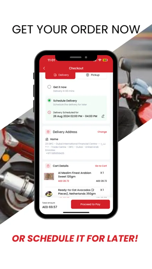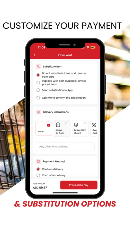 Choose home delivery both instant and scheduled, with 60-minute free delivery service, Also you can choose to pick up the groceries from store.