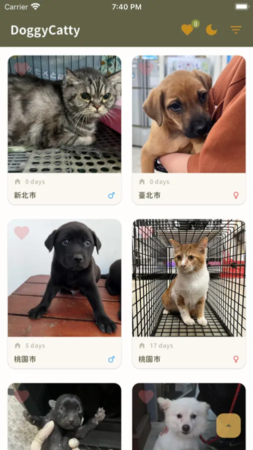 透過我們簡潔美觀的App,您可以輕鬆找到最適合您的狗狗或貓咪。查看每隻動物的詳細資訊,包括健康狀況、疫苗接種情況、安置天數以及收容所備註。喜歡的動物還可以加入收藏,方便日後查看。