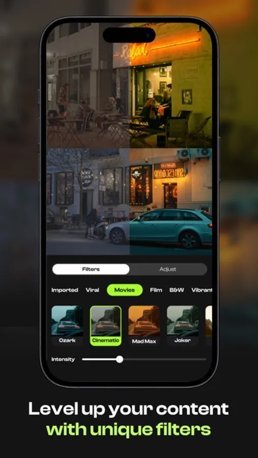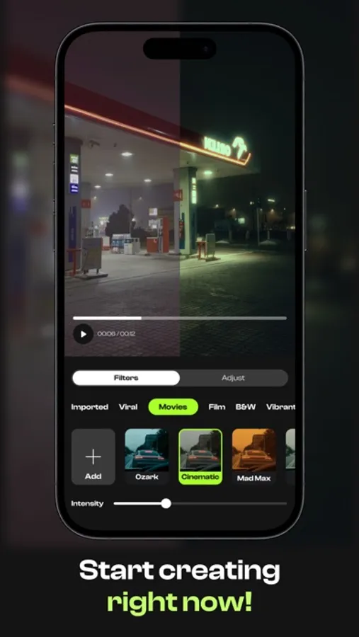 Import your clip, browse through our 90+ built-in LUTs, and instantly apply rich, moody, or vibrant tones. Our filters are optimized to match the color of a wide variety of footage styles. Whether you're aiming for a bold look or subtle enhancement, cinematic camera effects are now mobile.