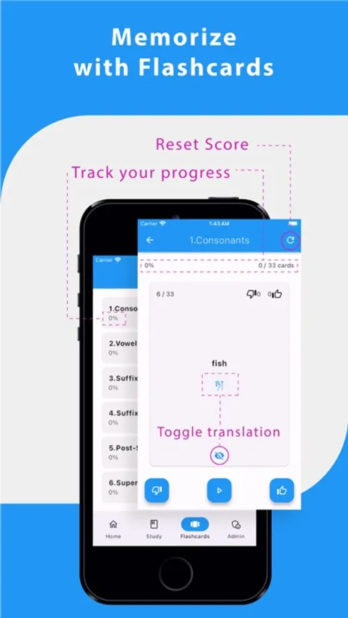 Interactive Flashcards: Enhance your vocabulary with our dynamic Flashcards feature. Challenge your memory and improve word recognition as you score yourself and progress through the cards, which are removed based on the personalized threshold settings in the Admin Page.