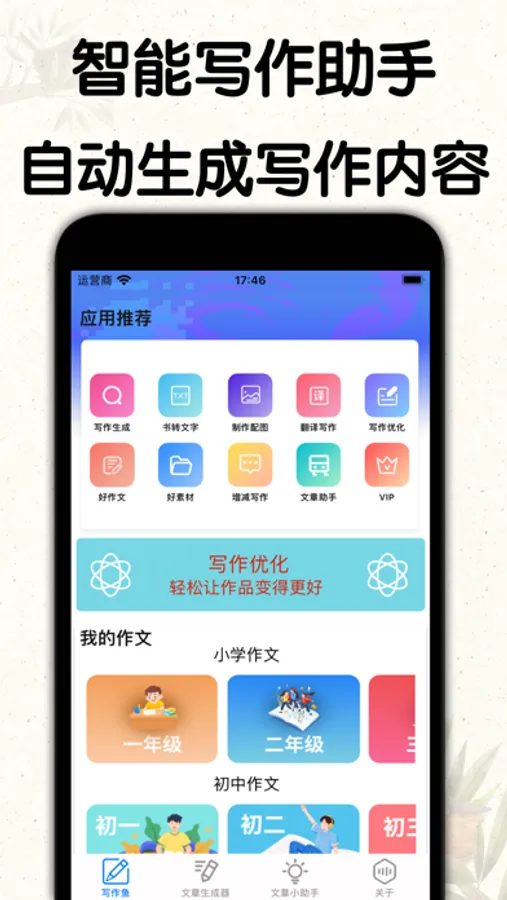 我们的app拥有多项实用功能:创新写作生成、写作优化、写作点评、文章小助手、好作文、好素材合集等等,帮助你轻松写出自己想要的文章。我们还收录近百万篇优秀经典作文和素材参考,帮助您提高写作水平,鉴赏优秀满意作品。优质的写作内容,覆盖全年级:小学、初中、高中。有数十种热门的主题:写人、叙事、写景、议论文、记叙文等。还有更多其他辅助功能,让您更好的把握好写作结构,写作时思路清晰、下笔利落。从而来提高自己的写作水平,顺利写出属于自己作品!