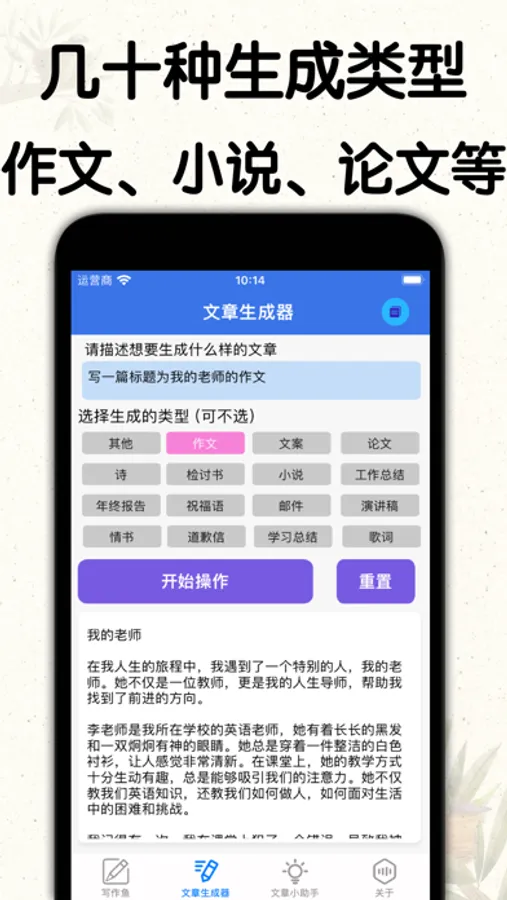 生成作文、论文、文案、小说、诗歌、检讨书、工作报告、日报周报、年终总结、、等等