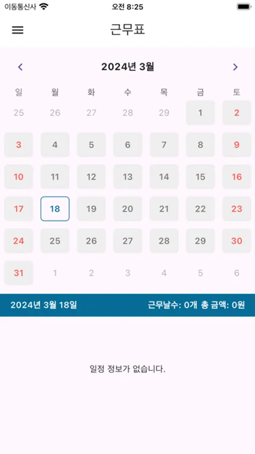 근무 스케줄은사용자가 근무 기록을 쉽게 관리할 수 있도록 달력 기능을 제공하며, 시간, 금액, 내용을 기록할 수 있습니다.