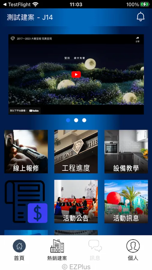 最新訊息、活動報名、電子書、專案活動、問卷調查、線上報修、繳款進度、工程相片、活動花絮。