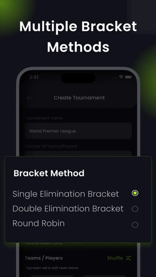- Bracket Methods: Most of the tournament bracket maker apps come with single elimination methods. However, that’s not the ideal way to run a tournament, that’s why we sat down with different tournament organizers and have added 3 different elimination methods i.e. Single, Double and Round Robin.