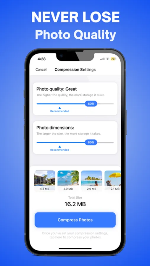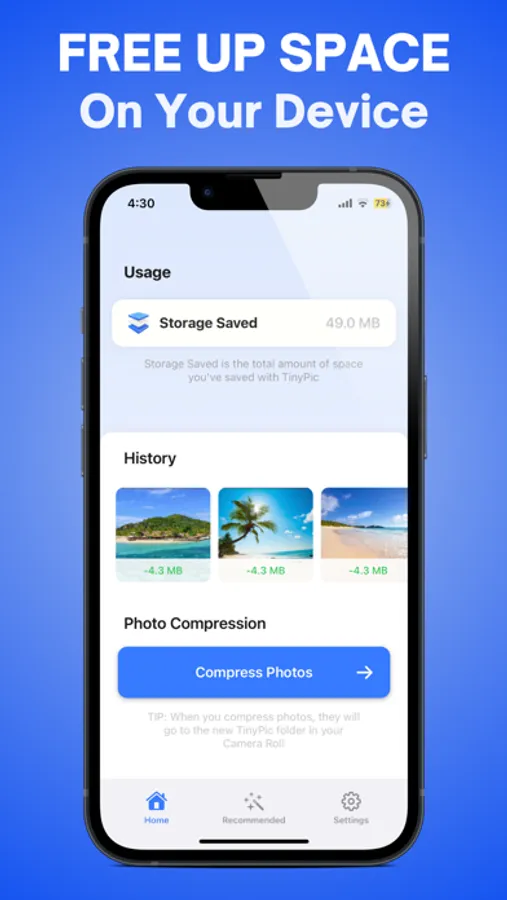 Looking to clear up your iPhone’s full storage? Let Tiny Pic Image Compressor reduce the file size of your pictures on your camera roll fast and easy.