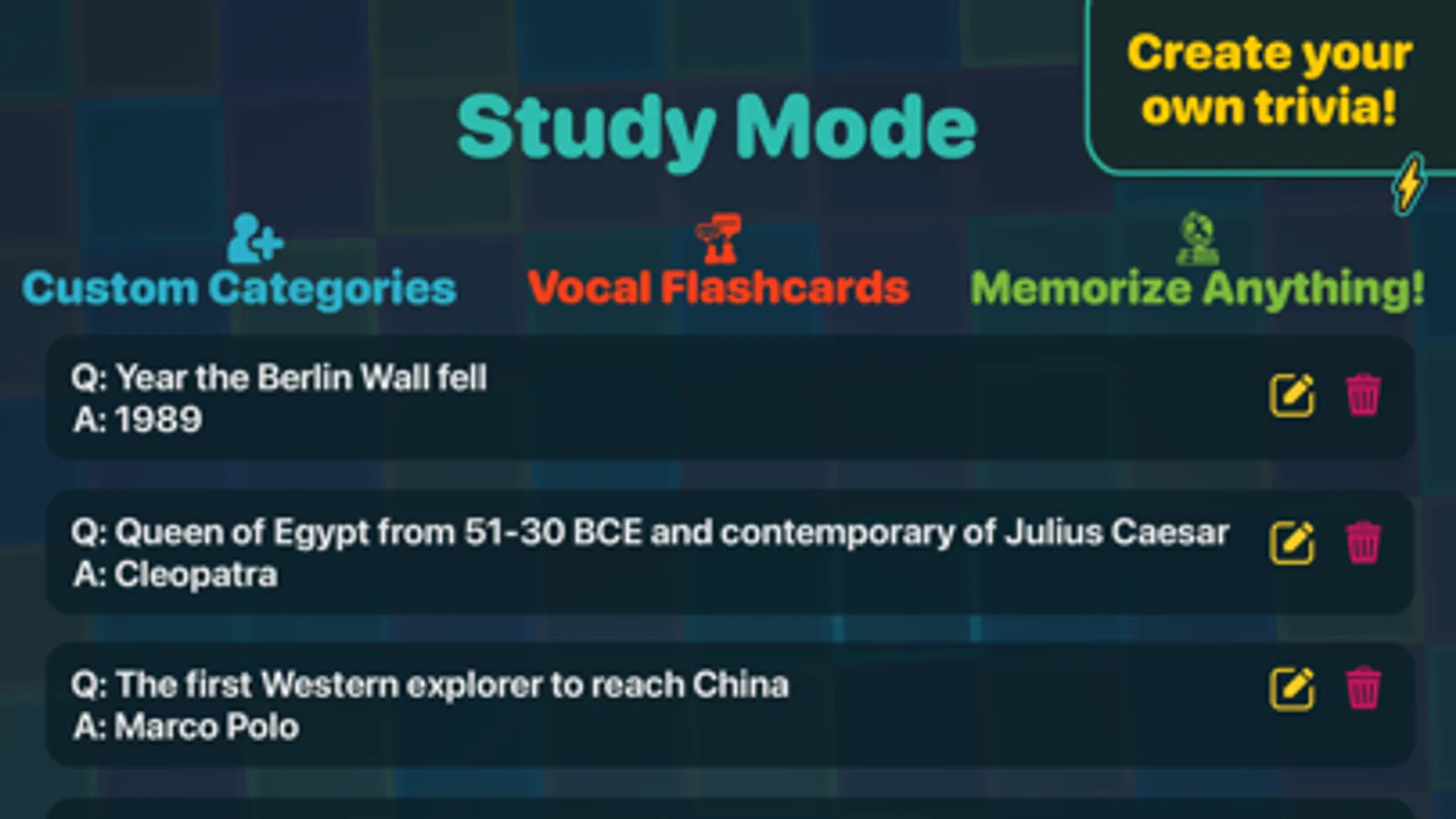 Lightning Round! also features a Study mode, which allows you to create your own trivia. Think of it as vocal flashcards. It’s a great way to study for a test or memorize anything you want to learn.