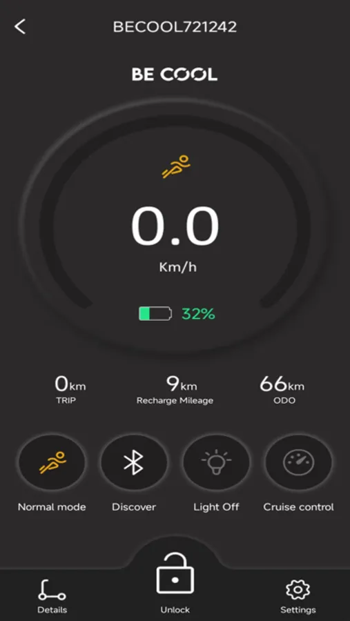 BE COOL is a smart electric scooter APP. Through the APP, you can view the detailed information of the scooter, set the speed and lock the scooter.