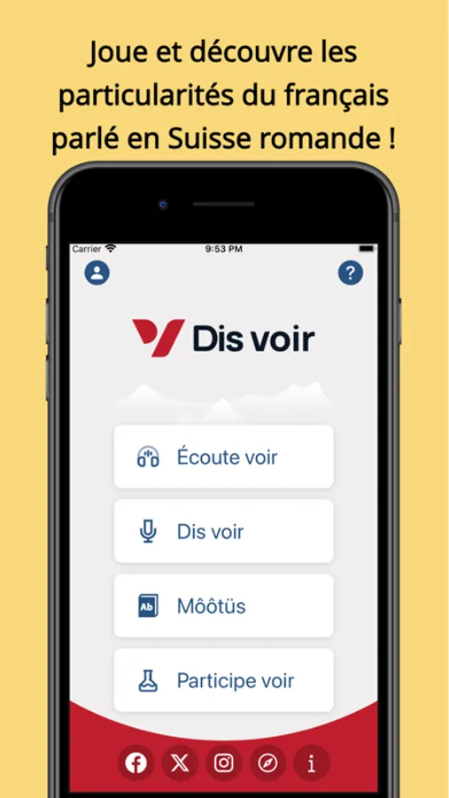 Du Jura au Valais, de Genève au Val-de-Ruz, le français parlé en Suisse n’a jamais ni les mêmes teintes ni les mêmes sonorités. Qui n’a jamais été surpris, en se rendant hors de son canton d’origine, par l’utilisation de telle ou telle expression ou la prononciation de tel ou tel mot ? L’application *Dis voir* a été conçue pour documenter et valoriser les variations linguistiques du français en Suisse romande. Aidez-nous à mettre en valeur cette variation tout en vous amusant !