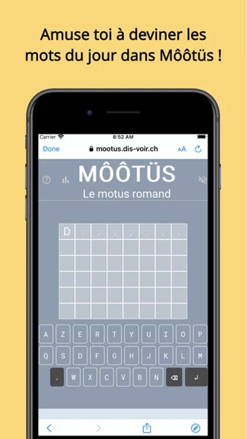 • Devine voir : Jouez à une variante du célèbre jeu MOTUS avec des mots suisses ! Devinez le mots caché du jour avec un nombre limité de tentatives. Testez vos connaissances du vocabulaire suisse romand et amusez-vous à découvrir de nouveaux termes.