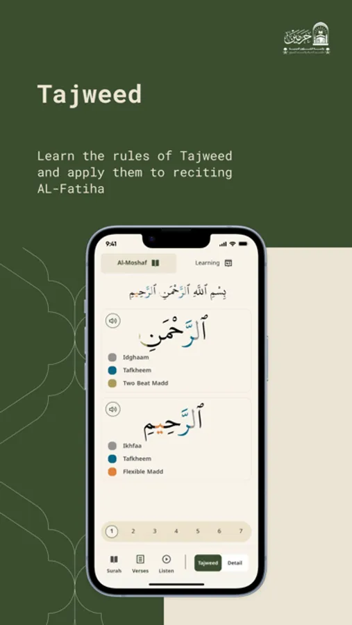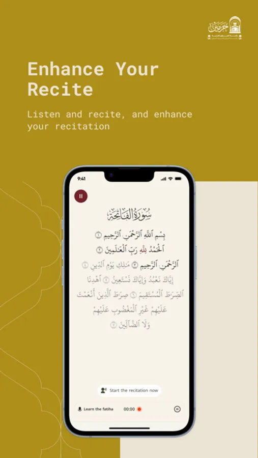 An interactive application aimed at serving visitors of the Two Holy Mosques by teaching Surah Al-Fatiha, its rulings, and correcting its recitation using modern technology. It provides a comprehensive educational content for interpretation, Tajweed, and memorization in multiple global languages. The app features an easy-to-use interface, employs AI tools to correct pronunciation errors during recitation, and offers detailed periodic reports to track user progress within a flexible and motivating learning environment available 24/7.