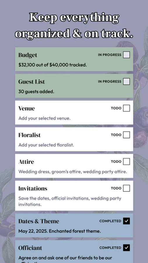 Planning your forever wedding is a magical time in your life and Inkberry is here to take the stress off your shoulders. Inkberry helps you to collaborate with your loved ones and helpers to plan for anything you want on your big day, and the days leading up to it.