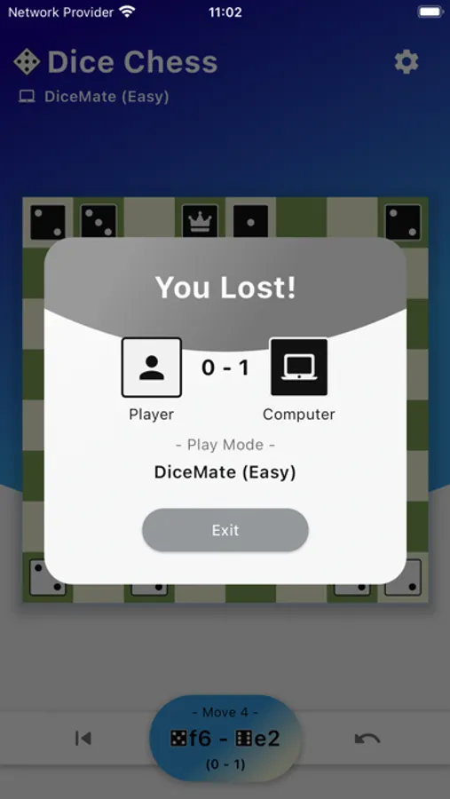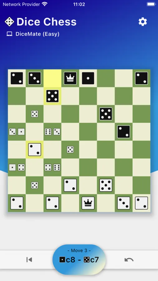 Dice Chess is a novel strategy game with dice on a chess board. Each die can move exactly the amount of squares that its face value shows. A die may turn 90° once during a move. While moving across the board, the die rotates in the direction its moving and thus the facing up value changes. This can create many complex strategical situations.