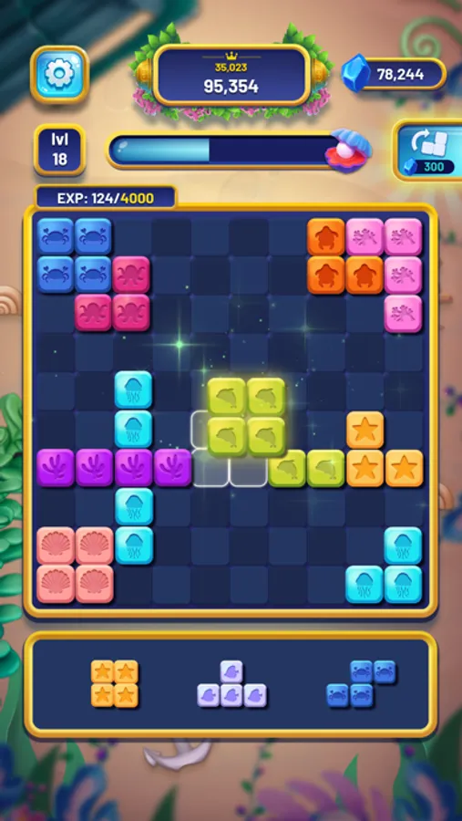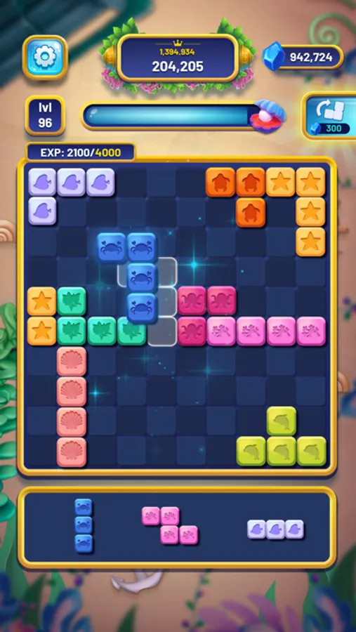 The traditional mechanics of well-known wood block puzzle games are preserved in Sea Block 1010 as well. Similar to playing a different block puzzle game, placing the block with the full line vertically or horizontally will make the block disappear and give you experience score. If your board is filled and you are unable to fill any more blocks, you will lose and cannot go on to the next level. As you go through the stages, collect gems to enable you to buy valuable boosters. In the challenging stage, you may also employ boosters for specialized support.