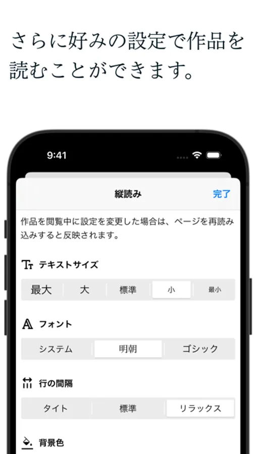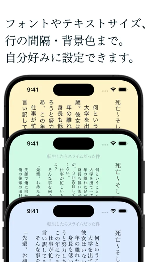 - テキストサイズやフォントなど、好みの設定で読むことができます