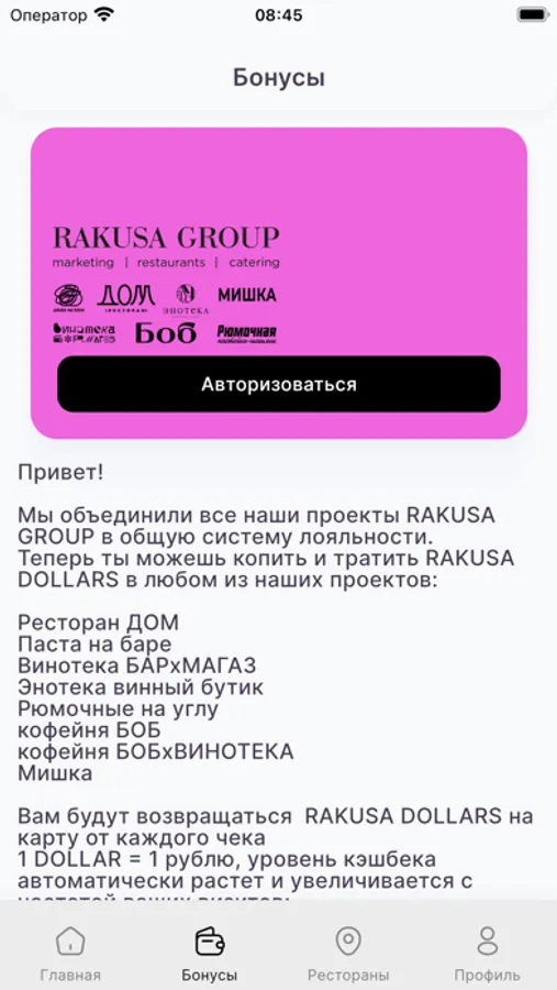 Ресторанная группа компаний «Rakusa Group». В мобильном приложении Rakusa Group можно получить доступ к нашей системе лояльности, чтобы получать бонусы с каждого заказа, тратить бонусы на следующие заказы.