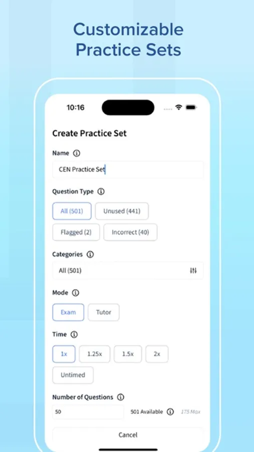 • Customizable Practice Sets : create personalized CEN practice sets that align with your specific needs to target weak areas and concentrate your studying.