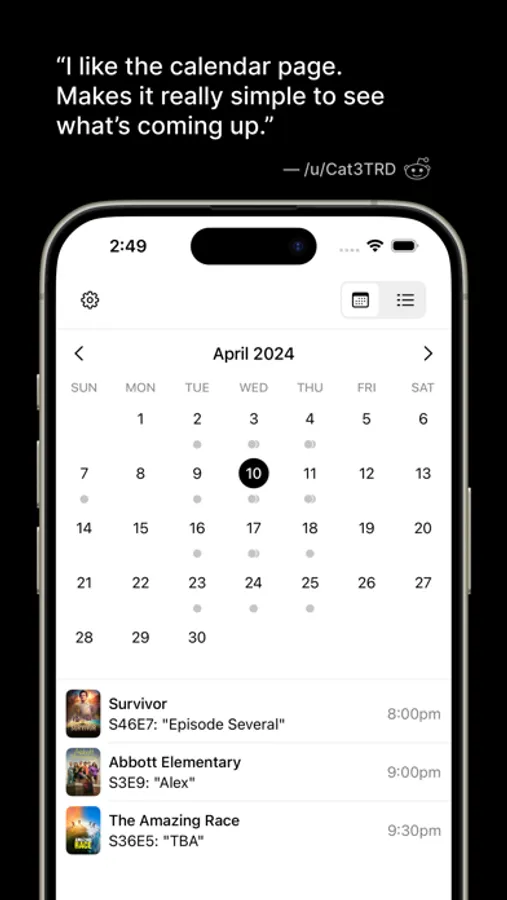 "I’ve used many tv tracking apps over the years but I’m digging this. Clean design and I’ve not seen any other app with a calendar view." — /u/dazzlerJJD
