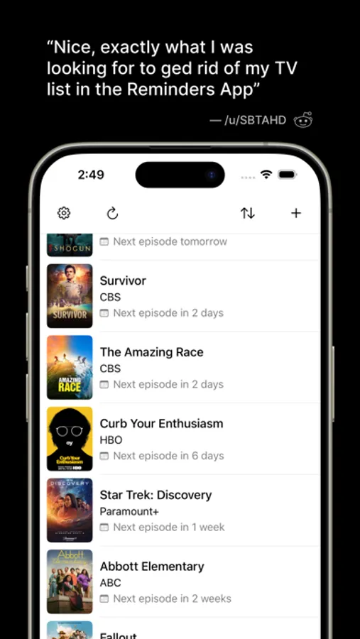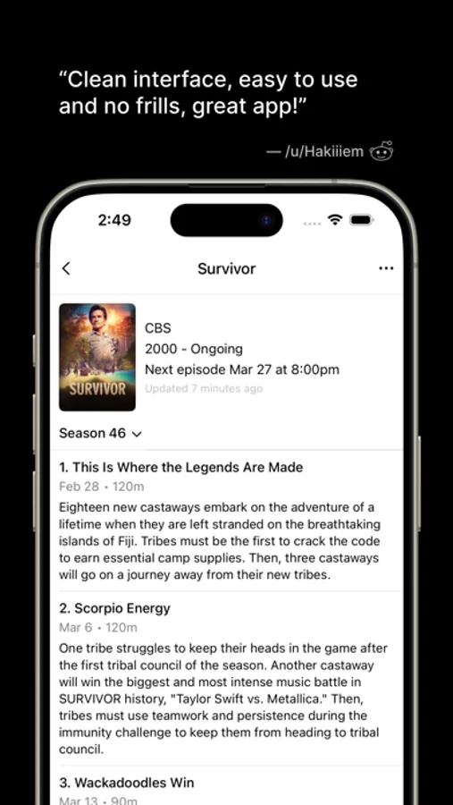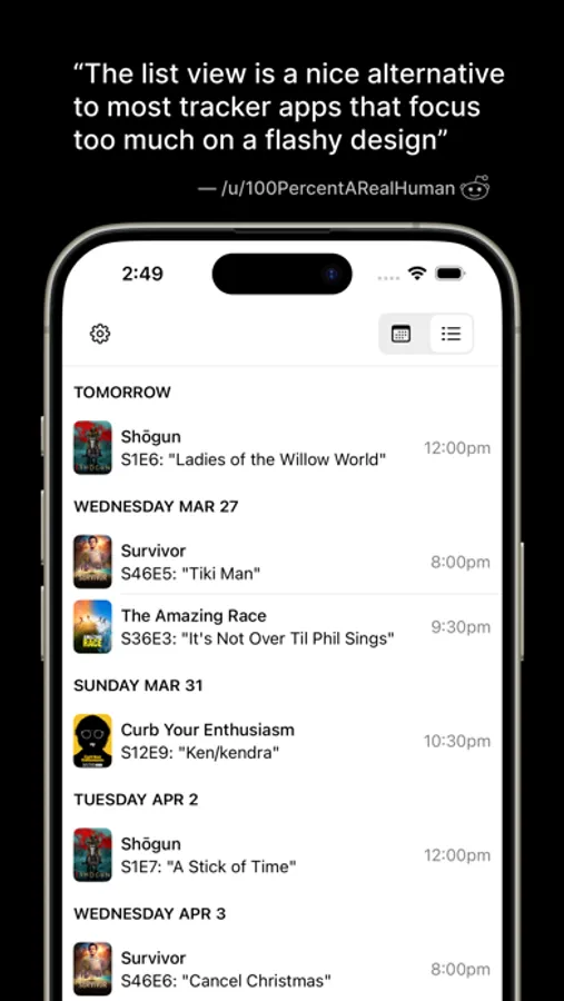 "This is so much cleaner than other apps, congrats on making this! I keep missing when shows come out so excited to use this (and the calendar is really nice and will save me time from manually doing it)" — /u/funkypanda42