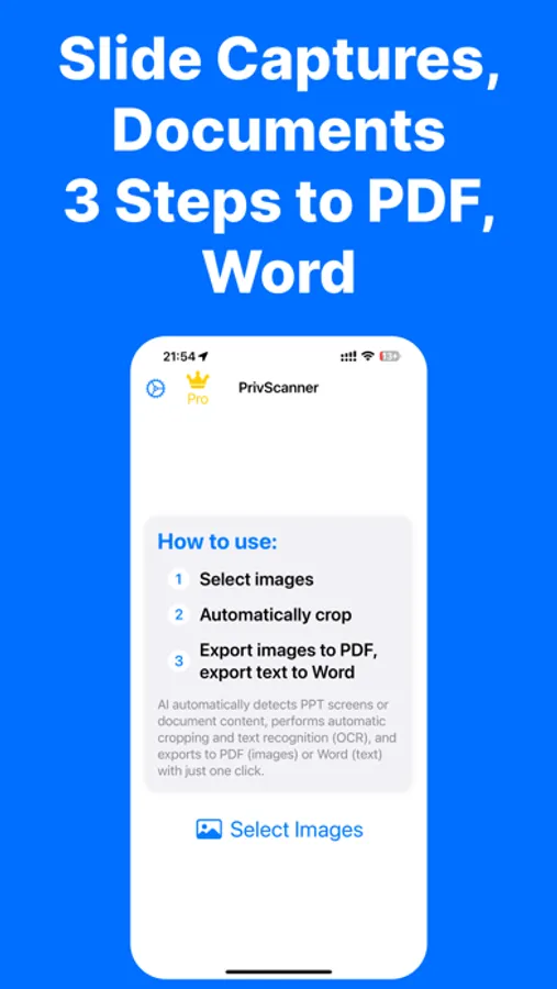 PrivScanner is an intelligent application that integrates document scanning, PPT photo processing, and text extraction. It supports one-click batch conversion of document photos and PPT photos into PDF, and text extraction into Word, making your work more efficient. Unlimited scanning functionality, free to use without limits.