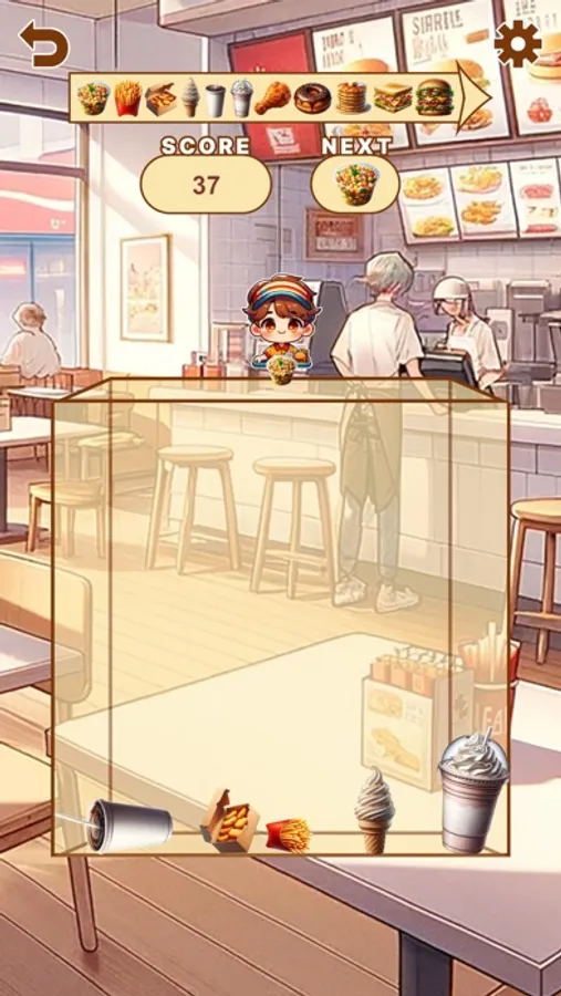 Join the staff at the burger shop to create a big, juicy hamburger! Arrange the items delivered by the staff carefully. When similar items touch, they merge into bigger ones. Work on merging lots of items, including various shapes, to craft your hamburger and aim for a high score! However, be careful not to let the items overflow from the box, as that will end the game. Use your wit and strategy to reach the top in this burger game!
