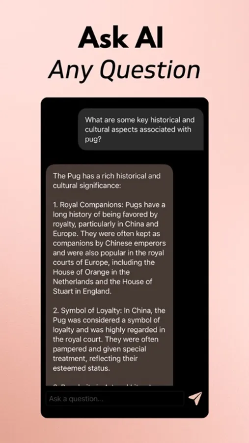 Ask AI Any Question: Have burning questions about a specific breed? Our AI-powered assistant is here to help. Ask anything—from historical origins to behavioral quirks—and receive instant, informative responses tailored to the identified breed.