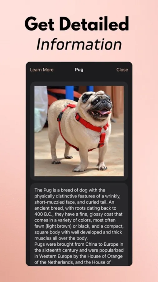 Get Detailed Information: Dive deeper into the world of each dog breed with comprehensive information. Dog Scanner equips you with all the knowledge you need to understand and appreciate every breed.