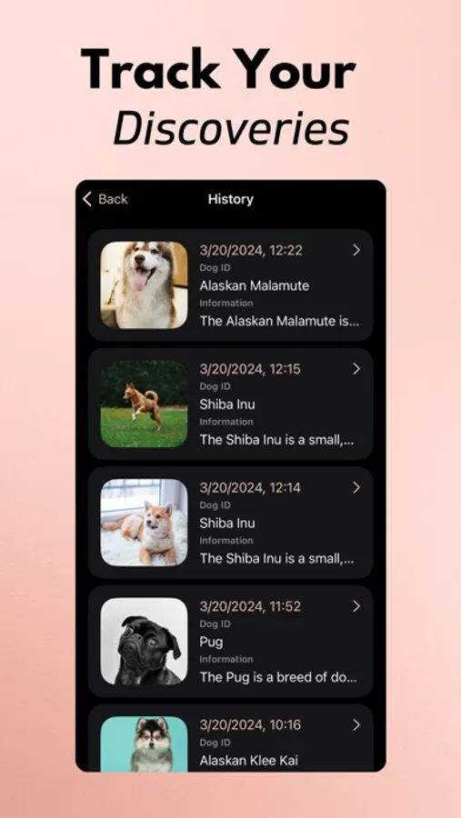 Track Your Discoveries: Keep a log of all the dog breeds you've identified with Dog Scanner. Easily save and revisit identified breeds whenever you want, right at your fingertips.