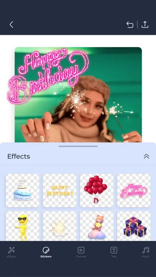 Lots of stickers and frames: choose from cheerful designs of balloons, birthday cakes, gifts, festive phrases, and much more.