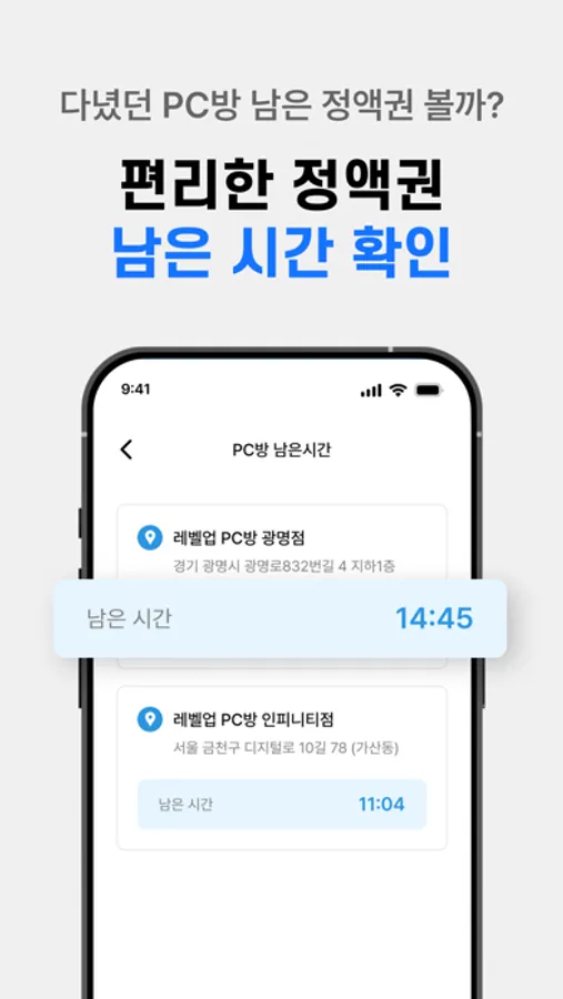 이용 중인 PC방 정보를 앱을 통해서 확인할 수 있어요. 혹시 종료를 하지 않았다면, 버튼 하나로 종료까지! 더욱 편리한 PC방 라이프!